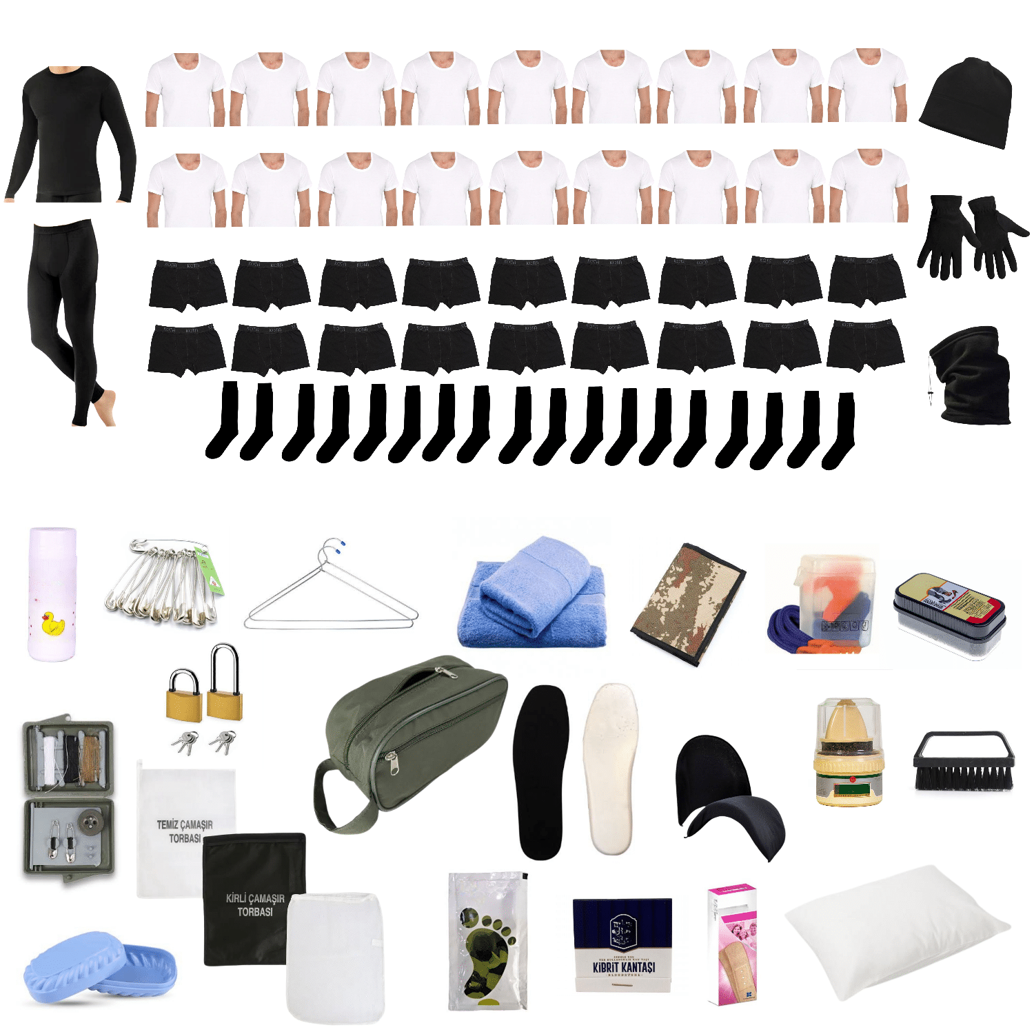 18’li Denizci Kışlık Uzun Dönem Askeri Seti, zorlu kış koşullarında askerlerin ihtiyaçları düşünülerek tasarlanmıştır. Set içinde 18 adet rahat ve sıcak tutan denizci askerler için beyaz fanila ve don (boxer), soğuktan koruyan 18 çift siyah çorap bulunur. Ayakkabı veya bot bakımı için bot boyası, parlatıcı sünger ve fırça ile ayak sağlığını koruyan pudra, bot vatkası, tabanlık ve güvenlik için bot kilidi mevcuttur. Kişisel eşyaların güvenliği için dolap veya valiz kilidi, boyuna asmalı asker cüzdanı ve kıyafetleriniz için metal dolap askıları yer alır. Pratik ihtiyaçlar için dikiş seti, tıraş çantası, sabun kutusu, çamaşır torbası ve filesi, kulak tıkacı, ayak koku giderici, yara bandı ve çengelli iğneler düşünülmüştür. Ayrıca kirli çamaşırlar için kirli çamaşır torbası ve temiz kıyafetler için ise temiz çamaşır torbası yer almaktadır. Hijyen ve konfor için 2’li banyo havlu seti, beyaz yastık kılıfı ve tıraş sonrası yaralar için kibrit kan taşı içerir. Soğuk hava koşullarına karşı siyah termal alt içlik, üst içlik, polar bere, boyunluk ve eldiven de setin parçaları arasındadır. 18‘li Denizci Kışlık Bedelli Askeri Seti ise, bedelli askerler için özel olarak hazırlanmış, benzer içeriklere sahip bir settir. Her iki set de askerlerin temel ihtiyaçlarını karşılamak ve kış aylarında maksimum konfor sağlamak için tasarlanmıştır.